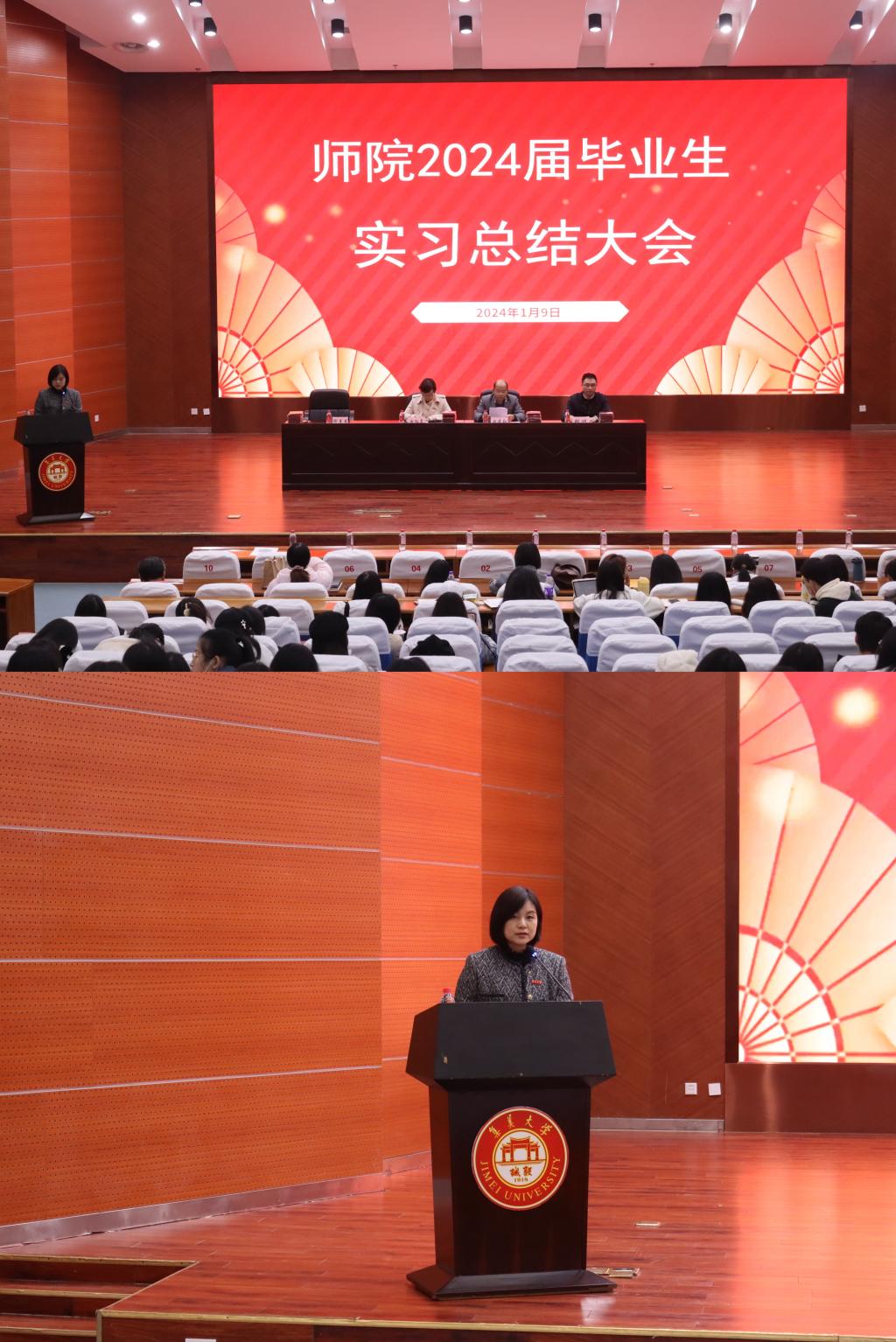 1月9日上午,师范学院2024届毕业生实习总结大会在尚大楼105报告厅举行。会议由学院副院长谢书书主持,学院党委书记田建和、院长赵红霞、副书记张鸿及各专业实习带队教师出席,2020级全体本科生参会。